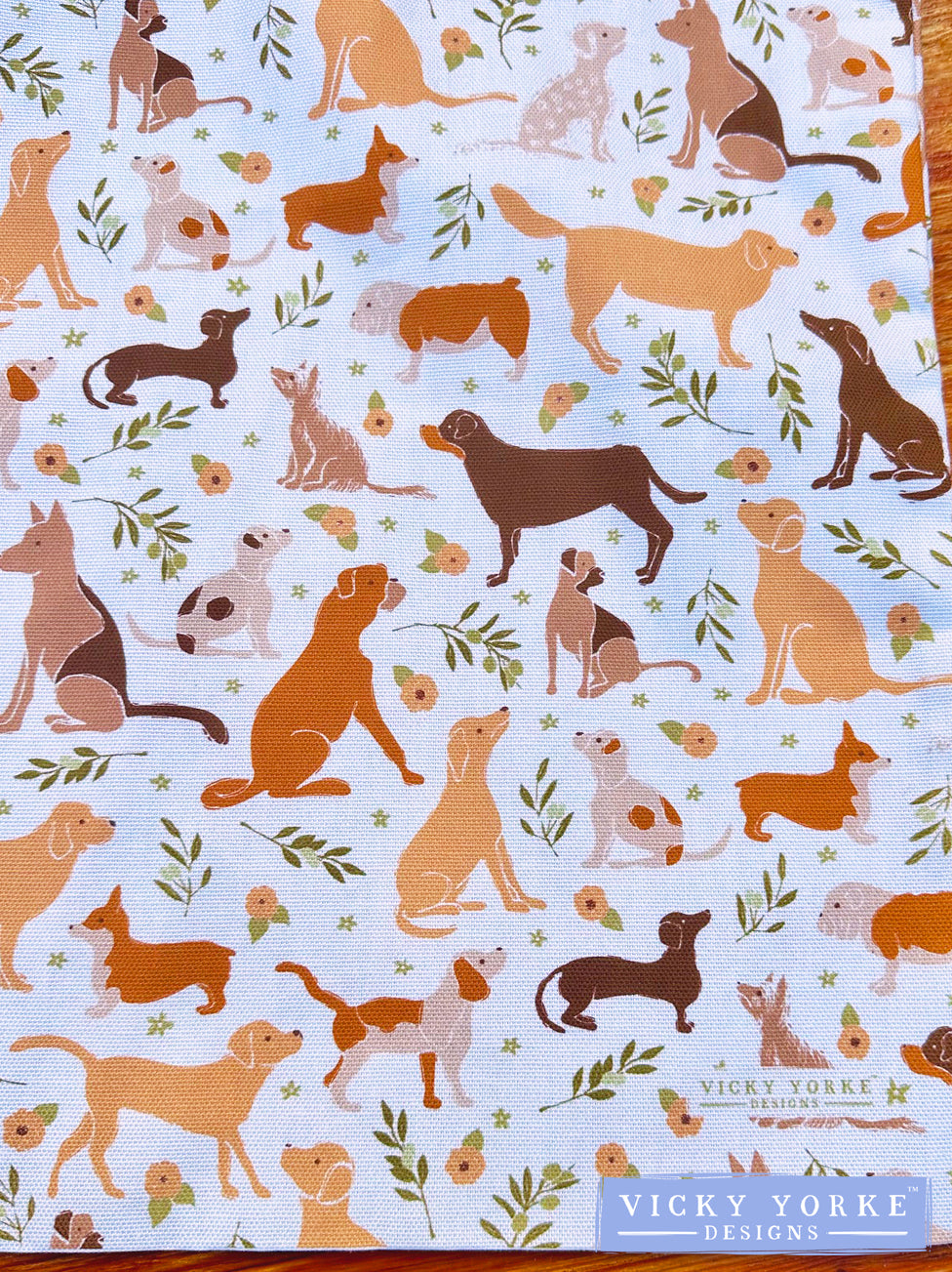Original 'Ginger & Olive - Dogs' Design: A playful, detailed pattern featuring various dog breeds (including a border terrier inspiration) and foliage, created by Vicky Yorke for her personal collection.