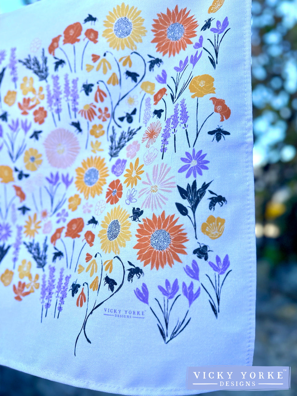 Bee Meadow & Wildflower Tea Towel | 'Summer Garden' Pattern | UK Made Cotton Kitchen Gift | Vicky Yorke Designs
