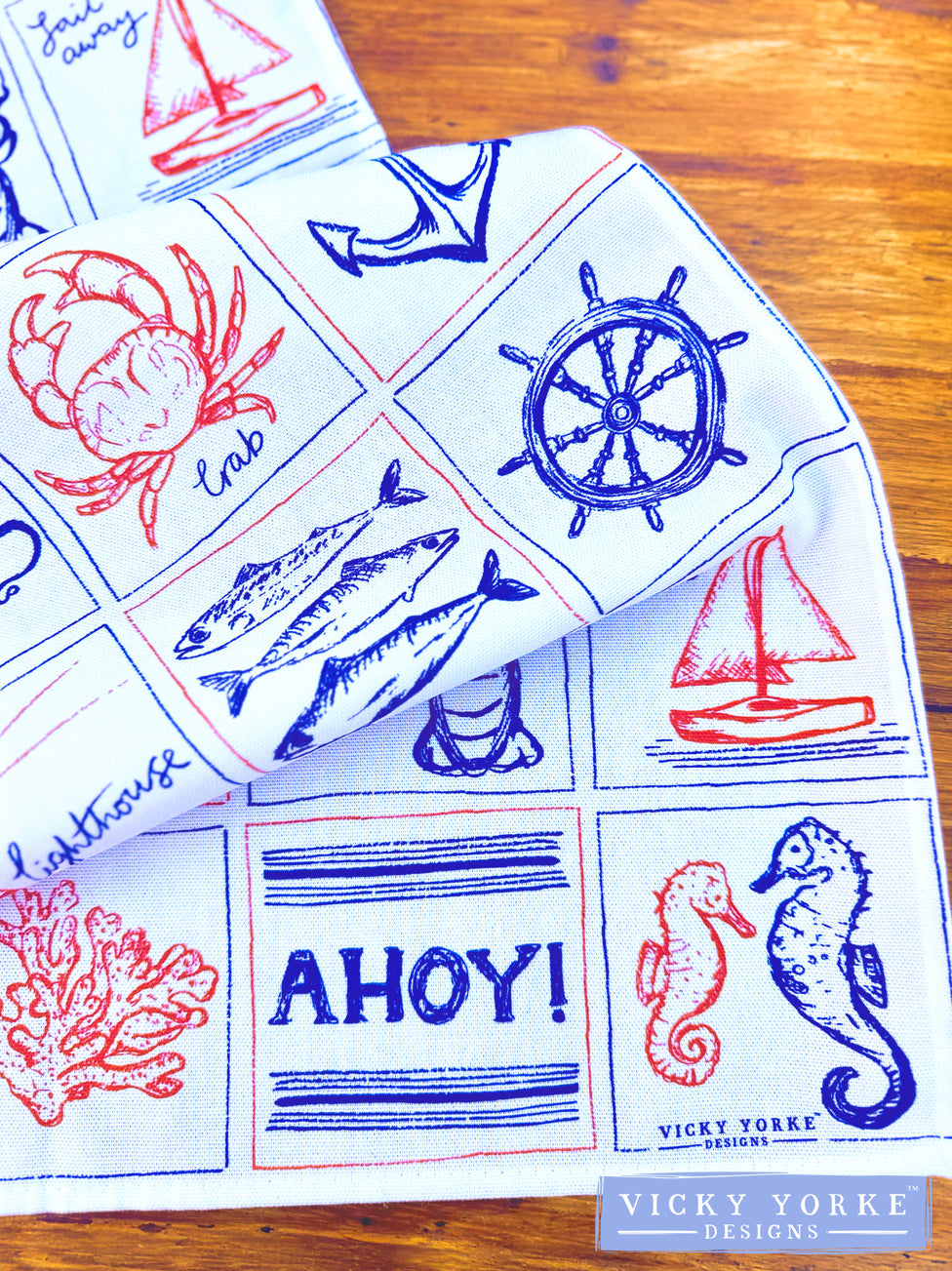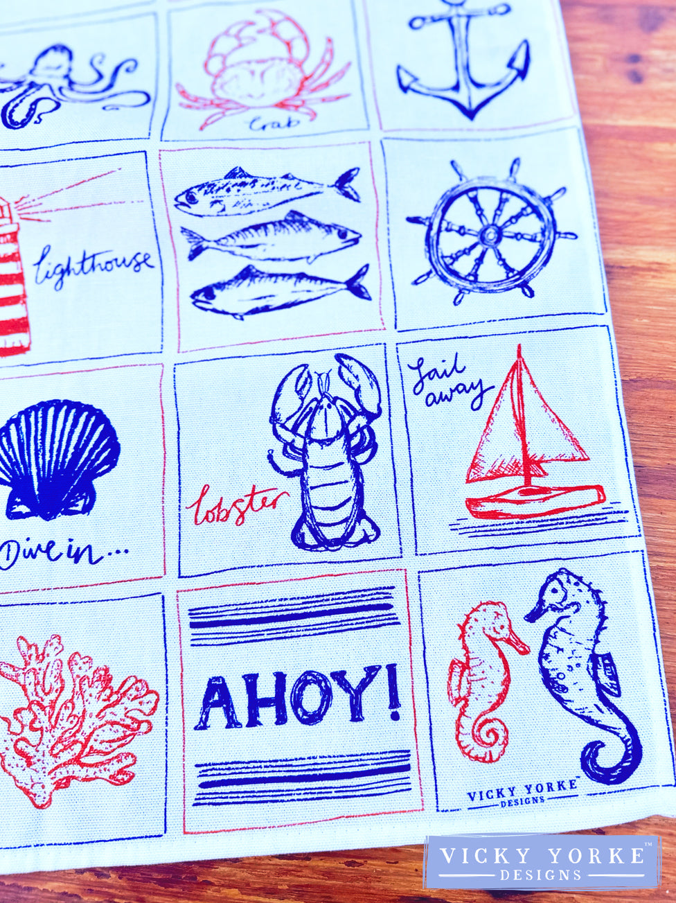 This unique and wonderfully practical eco-friendly cotton tea towel features an eye-catching, block-repeat surface pattern design by British designer Vicky Yorke. Inspired by the incredible marine life and nautical landmarks of her home on the Isle of Portland, Dorset, this tea towel is a perfect piece of coastal home decor.